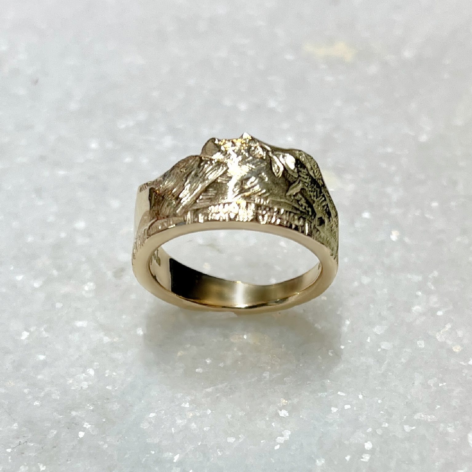 What’s with us and the constant attraction for mountains? Did you know that 44 % of Norway is mountains and forest? We have always made songs, poetry and art to honour nature and this unisex ring is a designed to go with you to the mountains, breathing outdoors. Take it on your adventures and fill it with your story. Solid 14K Gold ring. Made on demand – meaning that I start making when you order. During summer months when my store in Henningsvær, Lofoten is open, please allow at least 6 weeks if you order during late May, all of June, July and mid August. Usually it should take around 2-4 weeks, sometimes less.Hand-made and -engraved in 14K Gold.